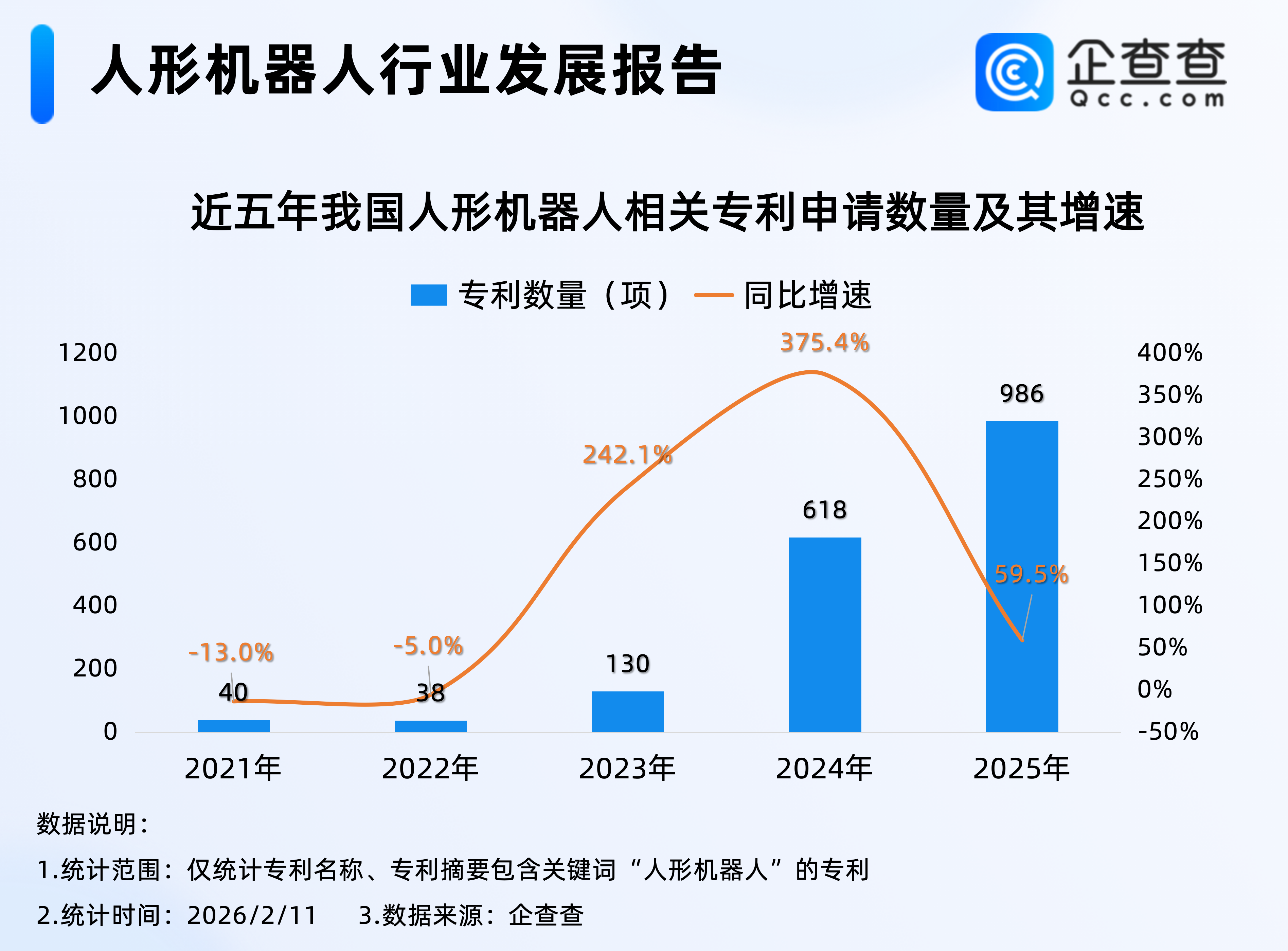企查查数据显示,我国现有2234项人形机器人相关专利,2021年以来,我国累计申请人形机器人相关专利1827项,其中2024年全年,相关专利申请数量同比激增375.4%至618项,达近五年相关专利申请量增速峰值;2025年全年,我国累计申请986项人形机器人相关专利,创近五年相关专利申请量新高。